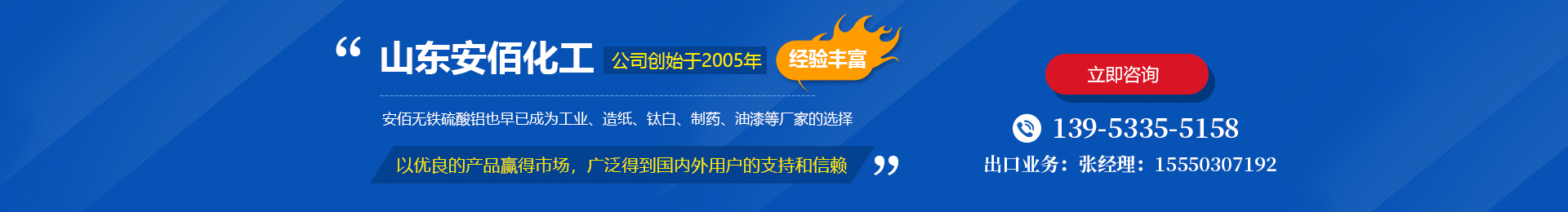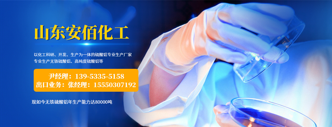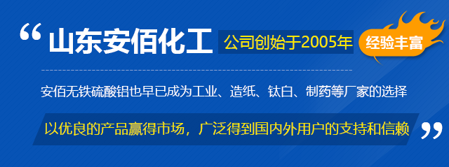 山东安佰化工有限公司是以化工科研、开发、生产为一体的硫酸铝专业生产厂家,专业生产无铁硫酸铝、高纯度硫酸铝等。公司创始于2005年,坐落在淄博市博山区域城镇李芽村,注册资金1000万元。从公司建立以来,通过十几年不断开拓新的思路,引进行业各种先进管理模式和新技术,其生产规模、能力得到快速扩展,现如今无铁硫酸铝年生产能力达80000吨,在行业中名列前茅。我公司坚持以人为本的原则运用先进的管理模式,以优良的产品赢得市场,广泛得到国内外用户的支持和信赖。安佰无铁硫酸铝也早已成为工业、造纸、钛白、制药、油漆、宝石、催化、等生产厂家的选择。